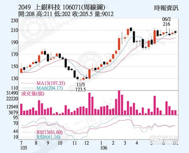 上銀科技(2049)拜大陸、歐洲及日本客戶對滾珠絲桿、直線導軌及機器人三大主力需求旺,在手訂單看到年底,日本汽車大廠跨海來臺洽談采購關鍵零件,外資估6月合并營收超越5月續創單月新高,上周五逆勢上漲2元而以205.5元作收,收復月線及季線,上周股價收平盤。