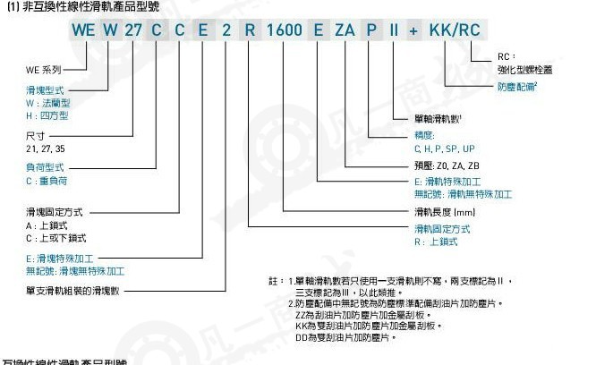 上銀導軌WE系列分為非互換性及互換性型兩種線性滑軌,兩者規格尺寸相同,主要差異點在于互換性型之滑塊、滑軌可單獨互換使用,較便利,但其組合精度無HIWIN互換性型之組合精度目前已達到一定的水平,對不需配對安裝線性滑軌的客戶而言,是一項便利的選擇。線性滑軌的產品規格型號主要標明線性滑軌尺寸、型式、精度等級、預壓等規格要求,以利訂貨時雙方對產品的確認。