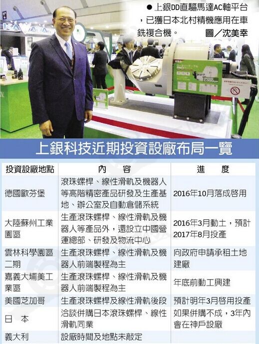 此外卓永財指出,上銀與多家日本生產(chǎn)滾珠絲桿、直線導(dǎo)軌等同業(yè)洽談,準(zhǔn)備收購日本傳動系統(tǒng)廠商,如并購不成,計畫3年內(nèi)于神戶設(shè)廠。