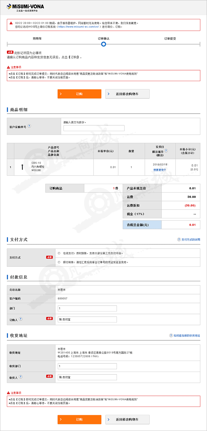 【訂購】后,進入訂單確認頁面;請選擇發貨方式,確認商品明細,支付信息和收貨地址。然后點擊【訂購】。