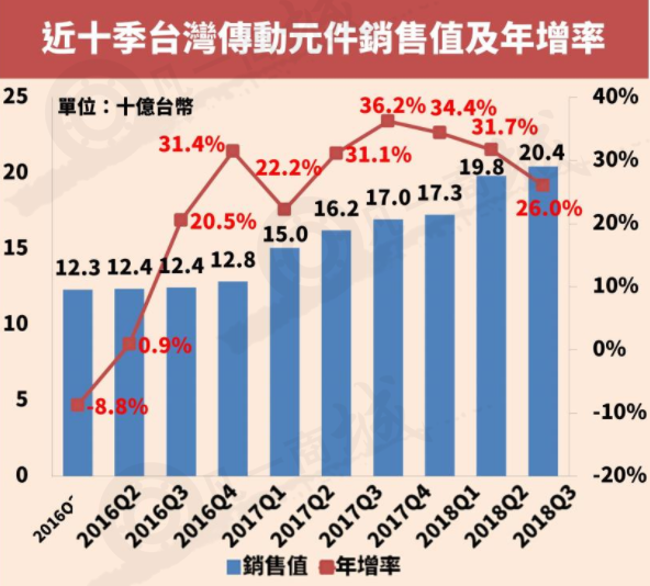 臺灣 2017 年生產傳動組件的年產值已經突破 600 億臺幣!其中超過七成的產值來自外銷!且滾珠絲桿之產值已列為全球第四。直線導軌與滾珠絲桿主要外銷區域為中國、南韓、德國、日本,所以傳動組件產業是一個很典型的出口導向行業。另外,我們也注意到每一季的年增率相當驚人,已經連續 8 季有超過 20% 的成長率!