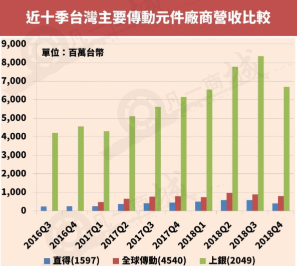 上銀在去年度第三季的營收已經突破 80 億臺幣;而全球傳動是在去年第二季創下接近 10 億營收的新高;最后,直得近兩季的營收大約都接近 6 億元。