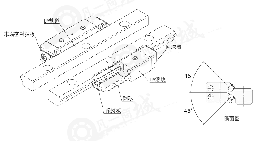 鋼球沿著LM軌道和LM滑塊上經(jīng)過精密研磨加工的2列滾動面進行滾動;通過組裝在LM滑塊上的回球器,使鋼球列循環(huán)運動。