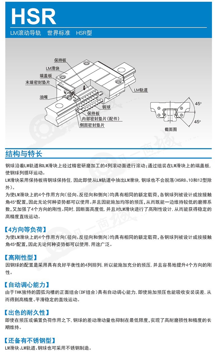 在LM軌道與LM滑塊的被精密研磨加工過的4列滾動(dòng)溝槽上球進(jìn)行滾動(dòng),再通過裝在LM滑塊上的端蓋板,使各列球進(jìn)行循環(huán)運(yùn)動(dòng)。 因球被保持板保持,即使將LM 滑塊從LM 軌道上抽出,球也不會(huì)脫落。(HSR8 , 10 , 12 型除外)。 為了使LM 滑塊的4 個(gè)方向(徑向方向、反徑向方向、橫方向)具有相同的額定負(fù)荷,各球列被設(shè)計(jì)成45 °的接觸角,無論使用何種姿勢(shì)都可以。并且因能施加均等的預(yù)壓,從而既能一邊維持較低的摩擦系數(shù),又加強(qiáng)了4個(gè)方向的剛性。同時(shí)、因斷面高度低、且對(duì)LM滑塊進(jìn)行了高剛性設(shè)計(jì),因而可以獲得穩(wěn)定的高精度直線運(yùn)動(dòng)。